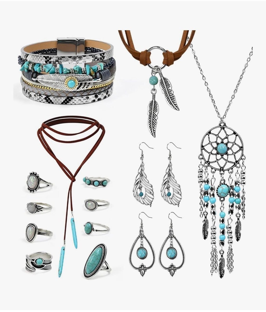Dieses Boho Schmuck Set Türkis für Damen vereint stilvollen Vintage-Look mit moderner Leichtigkeit und sorgt für einen einzigartigen Auftritt. Das 14-teilige Set bietet dir alles, was du für einen perfekten, abgestimmten Look brauchst – ideal für Sommer, Urlaub oder Festivals.