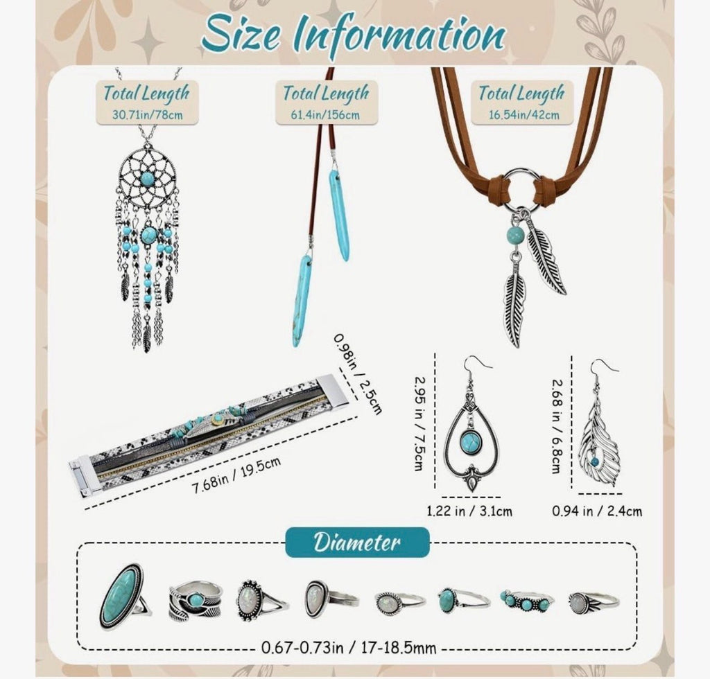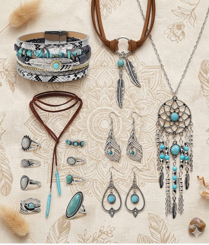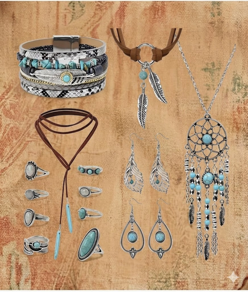 Das Set kombiniert Türkis-Optik, Federn und feine Metallelemente zu einem natürlichen, femininen Boho-Design. Perfekt passend zu Sommerkleidern, Strand-Outfits oder Festival-Looks.