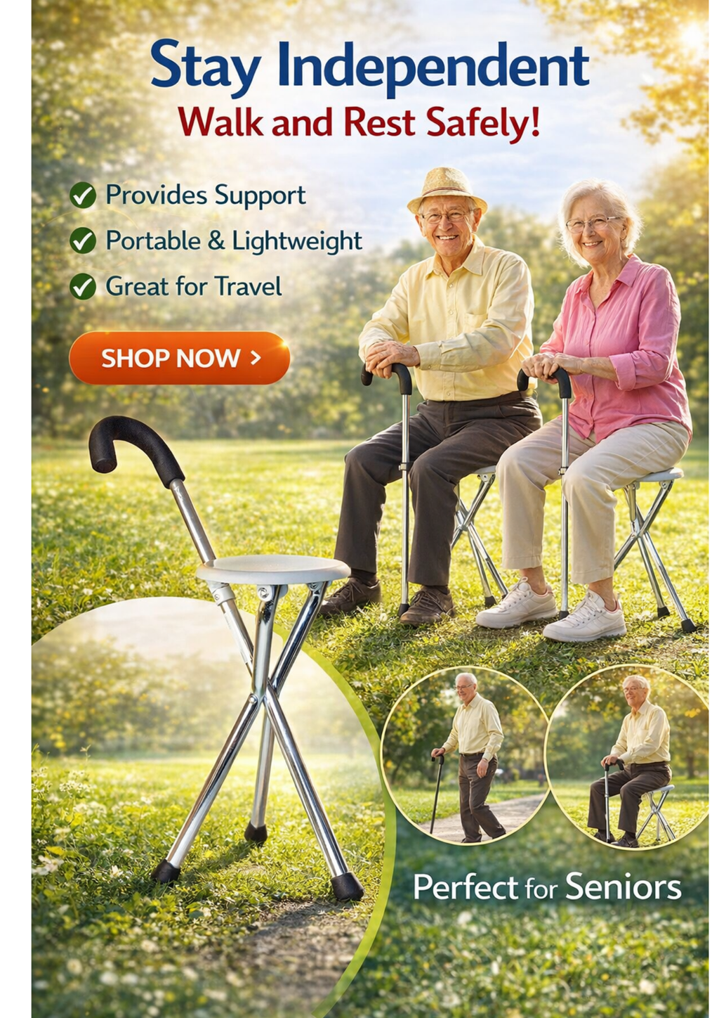 Dieser verstellbare Gehstock mit Sitz ist die ideale Unterstützung für Senioren und Personen mit eingeschränkter Mobilität.