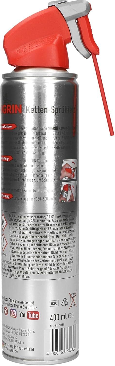 NIGRIN Ketten-Sprühfett, 400 ml, vollsynthetisch, schützt vor Verschleiß, minimiert Leistungsverluste