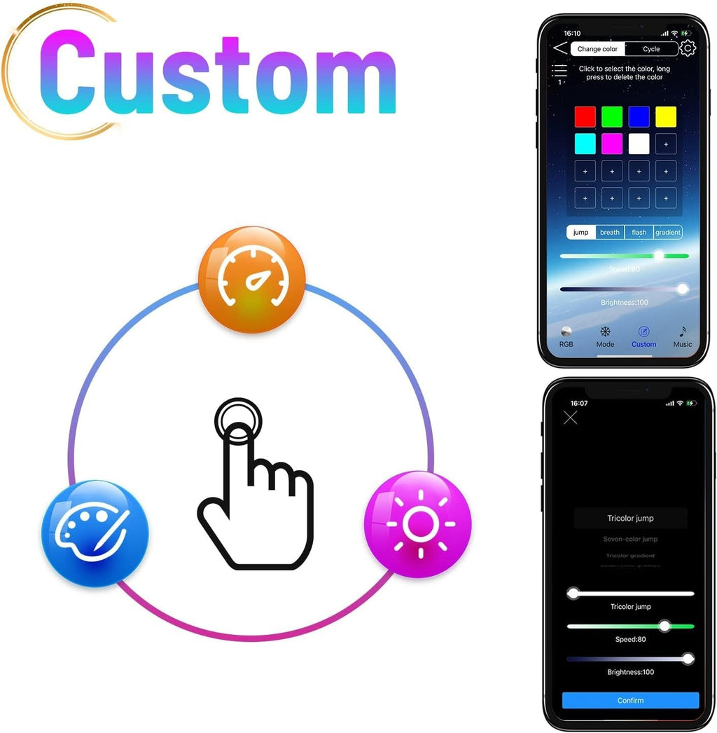 Über die App-Steuerung können Farben, Helligkeit, Geschwindigkeit und verschiedene Lichteffekte bequem eingestellt werden. Die integrierte Musik-Synchronisation passt das Licht automatisch an den Rhythmus Ihrer Musik an und sorgt für besondere Effekte bei Videos oder entspannter Atmosphäre.