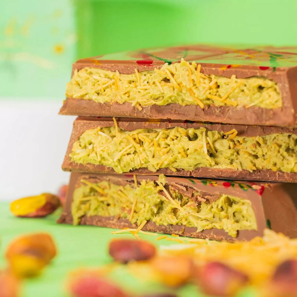 Diese besondere Schokoladenspezialität kombiniert cremige Pistazienfüllung mit knusprigem Kadayif – ein Geschmackserlebnis, das von orientalischer Süßwarentradition inspiriert ist.