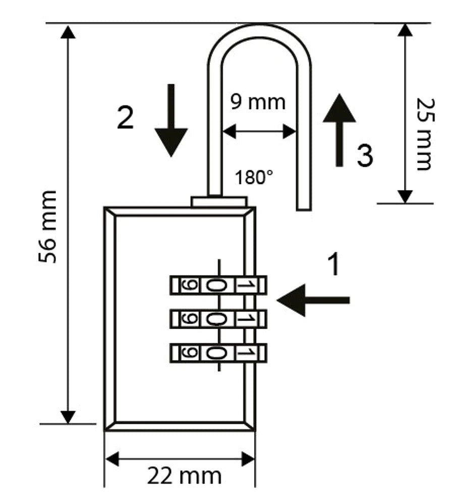 • 1 × Vorhängeschloss 22 mm mit Zahlencode